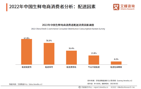 2022年生鮮行業發展趨勢數據顯示,生鮮消費者優先關注配送速度(67.0%)、配送準時(56.8%)。進入2022年,國內疫情反復,生鮮電商運力不足的問題凸顯。因此,面對龐大的市場需求,企業提升配送能力,滿足消費者購物需求,有望拉動生鮮電商市場的增長。