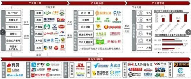 中游:通過(guò)生鮮電商搭橋,依靠物流、支付平臺(tái)等相關(guān)服務(wù)將商品配送給下游消費(fèi)者