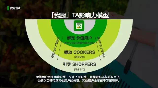 上圖是我廚建立的影響力模型。這個影響力模型,涉及如何綁定價值客戶,如何撬動資深父輩用戶到平臺上來,如何引導網生時代成為新用戶。