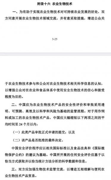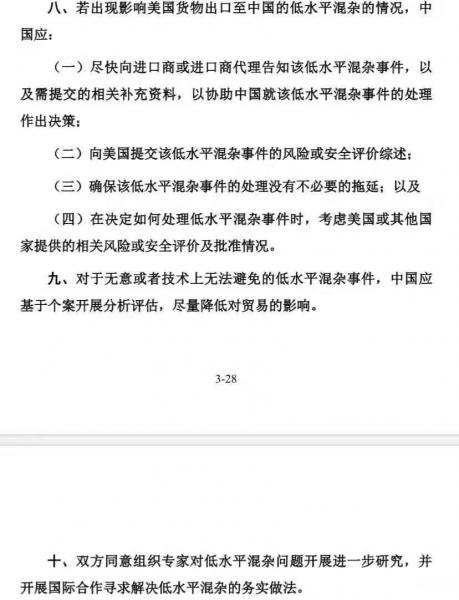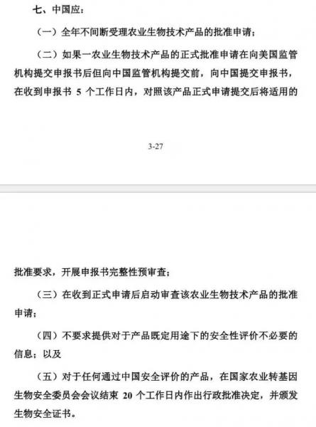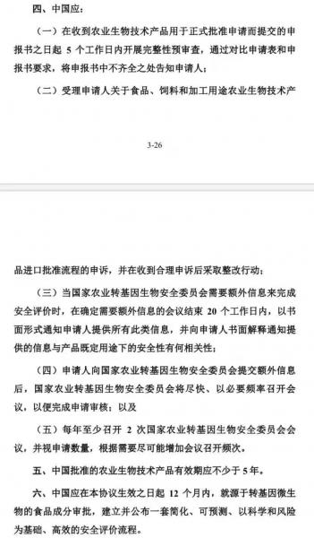 周三美國政府公布的第一階段協(xié)議英文文本稱,中國同意就農(nóng)業(yè)生物技術(shù)產(chǎn)品評估以及授權(quán)實(shí)施“透明、可預(yù)期、有效、基于科學(xué)和風(fēng)險(xiǎn)”的監(jiān)管流程。中國將平均在24個月內(nèi)完成用于飼料或進(jìn)一步加工的產(chǎn)品的審核以及授權(quán)工作。中國同意改進(jìn)申請流程的管理措施,采取一定措施來解決(美國產(chǎn)品中含有)低含量轉(zhuǎn)基因成分的問題,以及建立批準(zhǔn)轉(zhuǎn)基因食品原料的安全評估流程。