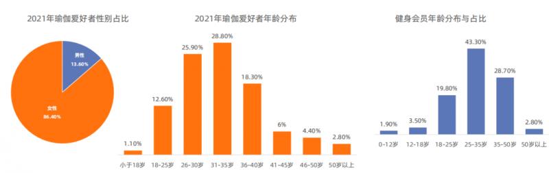瑜伽:職場青年面臨著越來越快的生活節奏和持續增長的工作壓力,往往需要找到適當的情緒出口,而瑜伽便成了人們尋求寧靜的新選擇,越來越多的泛人群開始向瑜伽核心用戶轉化。2021年瑜伽愛好者中女性居多,且26-40歲中青年占據著較大份額,Z世代群體占據12.6%,未來可能會有增長趨勢。