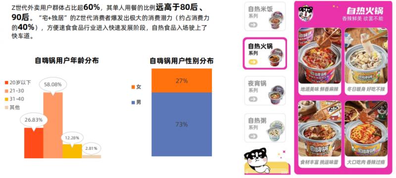 在當前快節奏的生活環境下,“宅文化”興起,“一人食”正在成為大多數消費者的常態,這些在Z世代人群中體現的尤為明顯。“自嗨鍋”是2017年注冊的互聯網自熱食品品牌。創始人將正宗重慶火鍋與自熱技術相結合打造出了行業內熱度和銷量排名最高的自熱火鍋。