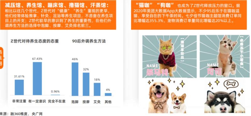 與80后相比,Z世代的消費人群有個顯著特點就是對養生、養顏特別關注,并成為健康消費的主力軍。據阿里健康公布的數據,2020年“6.18”期間,平臺眼部保健類產品銷售同比增長4126%,蛋白粉同比增長751%,維生素類產品同比增長387%;其中“Z世代”成消費主力,活躍用戶同比增長126%。據《2017-2022中國健康養生行業市場發展現狀及投資前景預測報告》,我國健康養生市場規模已超過萬億元,城市常住居民年均花費超過1000元用于健康養生,其中,18至35歲的年輕人群占比高達83.7%。
