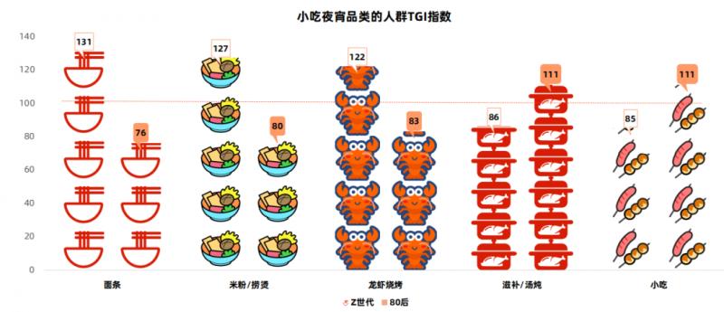 Z世代鐘愛小吃夜宵,品類的消費年輕化特征明顯,Z世代及80后兩大類消費人群占總人群的64%,Z世代的人群數量更多,是80后 的125%;