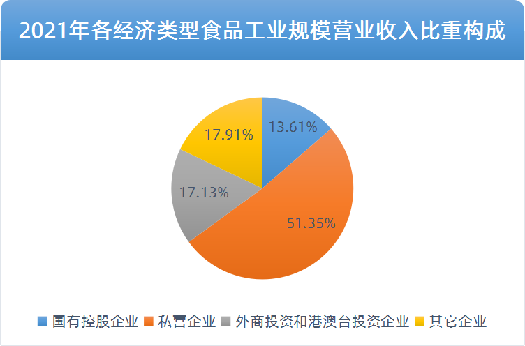 2021年河北省食品工業(yè)規(guī)模企業(yè)數(shù)量、營業(yè)收入、利潤總額中,私營企業(yè)分別占77.15%、51.35%、57.65%。由此可見,私營企業(yè)無論在營業(yè)收入以及利潤貢獻(xiàn)均處于絕對拉動(dòng)地位。