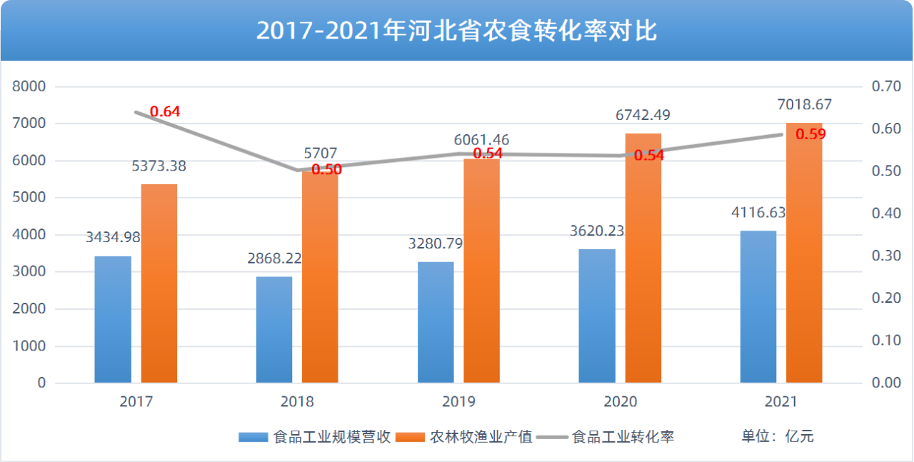 2017-2021年河北農(nóng)食轉(zhuǎn)化率呈現(xiàn)先減再增趨勢,整體降低明顯。2017年農(nóng)食轉(zhuǎn)化率達(dá)到峰值為0.64,2018年農(nóng)食轉(zhuǎn)化率達(dá)到谷值0.5。