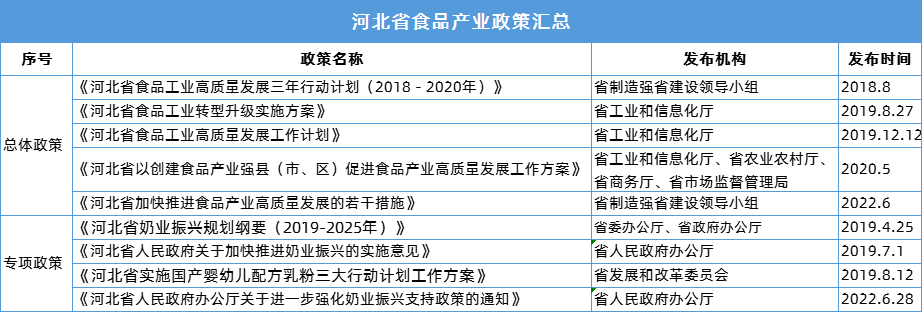 綜合比較河北省食品產(chǎn)業(yè)總體政策與專項(xiàng)政策可知,食品工業(yè)逐漸走向集群化、規(guī)模化、品牌化。奶業(yè)正在成為農(nóng)業(yè)主導(dǎo)產(chǎn)業(yè),乳制品產(chǎn)業(yè)正在成為食業(yè)主導(dǎo)產(chǎn)業(yè),通過實(shí)施“千萬噸奶工程”,持續(xù)提升全產(chǎn)業(yè)鏈競爭力,全面實(shí)現(xiàn)奶業(yè)振興,在全國率先實(shí)現(xiàn)奶業(yè)現(xiàn)代化,奶源基地、乳品加工、乳品品質(zhì)、乳品品牌整體水平進(jìn)入世界先進(jìn)行列。