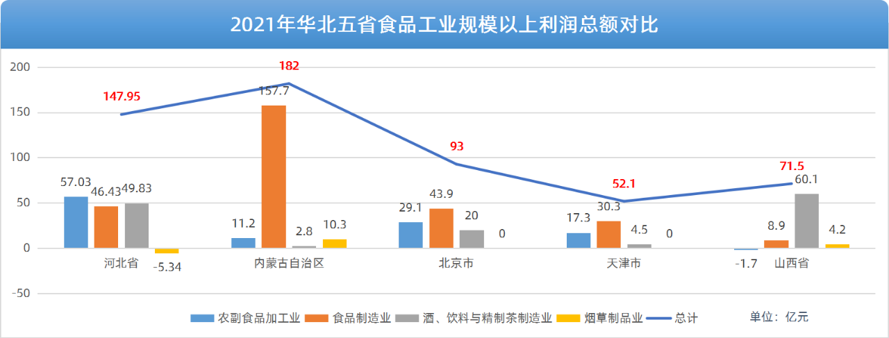 綜合比較企業(yè)數(shù)量、營業(yè)收入、利潤總額三個(gè)指標(biāo),河北省企業(yè)數(shù)量與營業(yè)收入均處于絕對領(lǐng)先位置,但利潤總額不及內(nèi)蒙古自治區(qū)。主要由于河北農(nóng)副食品制造業(yè)比重大,食品制造業(yè)比重較小,以及多年煙草制品業(yè)處于負(fù)利狀態(tài)。