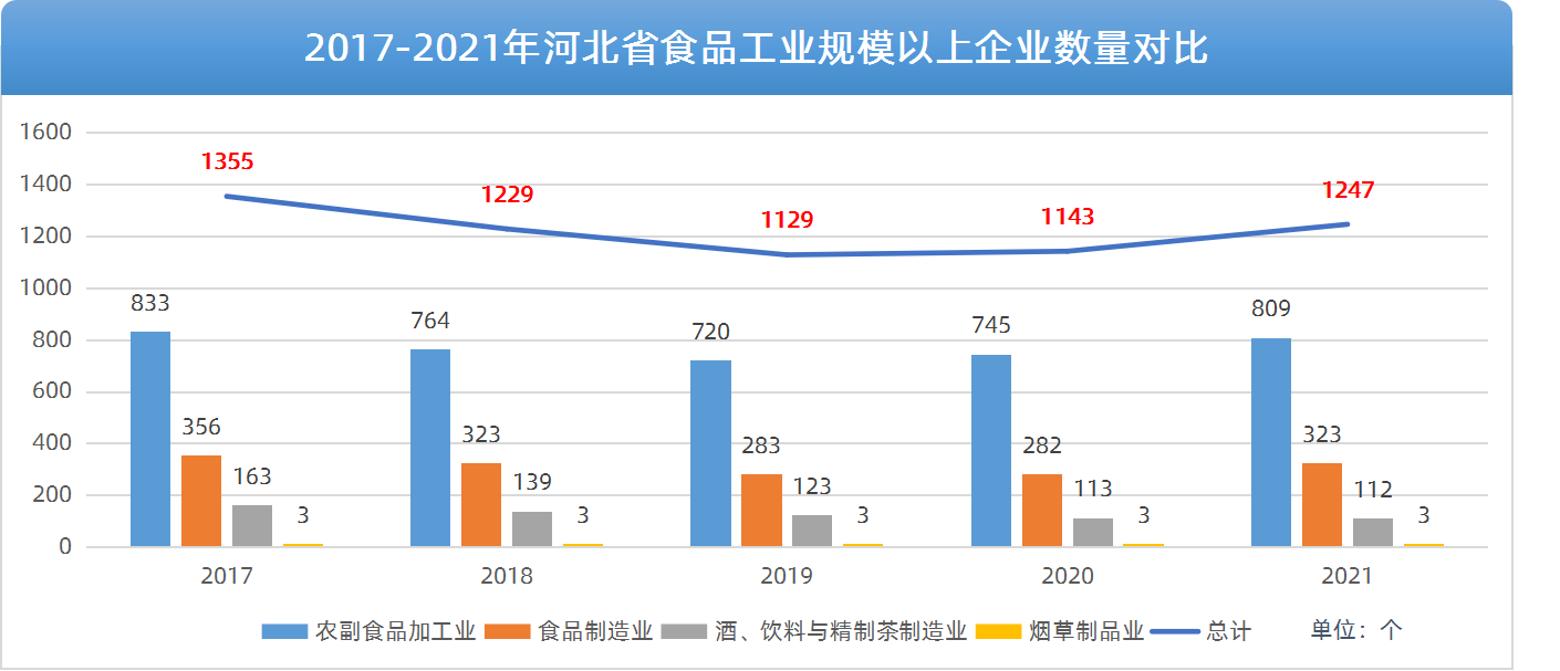 2017-2021年河北省食品工業(yè)規(guī)模以上企業(yè)數(shù)量呈現(xiàn)先遞減再遞增趨勢。分析內(nèi)部結(jié)構(gòu)可知,酒、飲料與精制茶制造業(yè)一直處于遞減狀態(tài)。農(nóng)副食品加工業(yè)先減后增,食品制造業(yè)近兩年進(jìn)入復(fù)蘇階段,增長潛力較大。