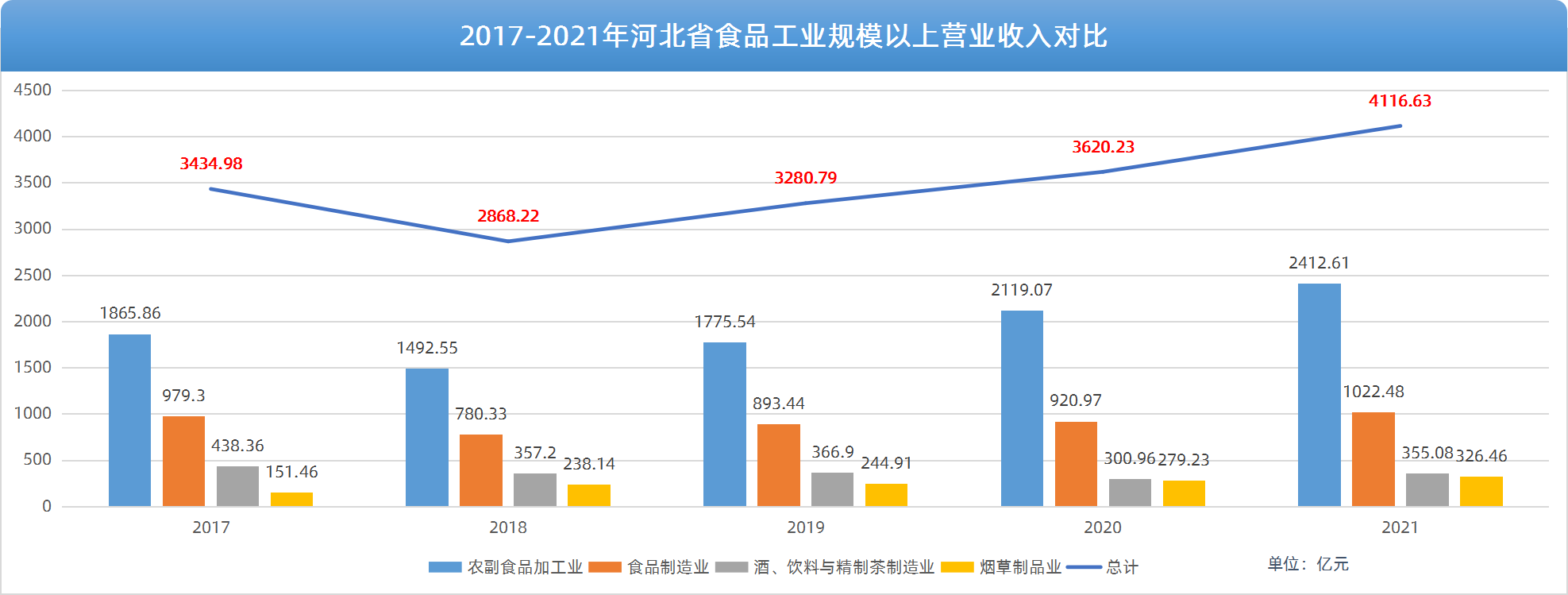 2017-2021年河北省食品工業(yè)規(guī)模以上營業(yè)收入呈現(xiàn)先減再遞增趨勢,增長率為43.5%。分析內(nèi)部結(jié)構(gòu)可知,增長動(dòng)力排序?yàn)檗r(nóng)副食品加工業(yè)>煙草制品業(yè)>食品制造業(yè)>酒、飲料與精制茶制造業(yè)。