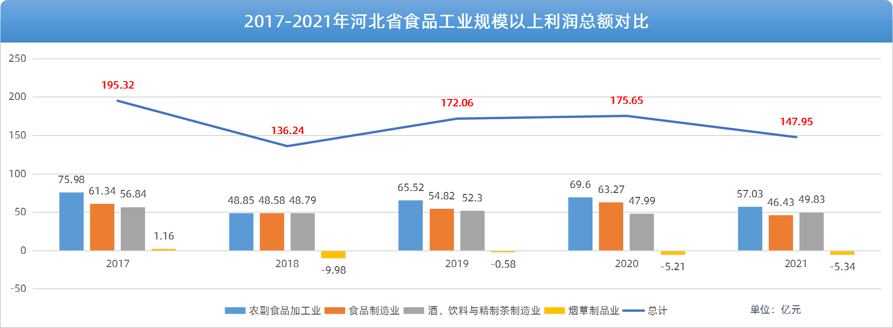 2017-2021年河北省食品工業(yè)規(guī)模以上利潤總額呈現(xiàn)先減再遞增再減少趨勢,整體利潤下降率為24.2%。一方面由于煙草制品業(yè)利潤由正增長轉(zhuǎn)為負(fù)增長,另一方面由于整個(gè)食品工業(yè)利潤增長乏力,尤以農(nóng)副食品制造業(yè)利潤增長動(dòng)力不足最為明顯。