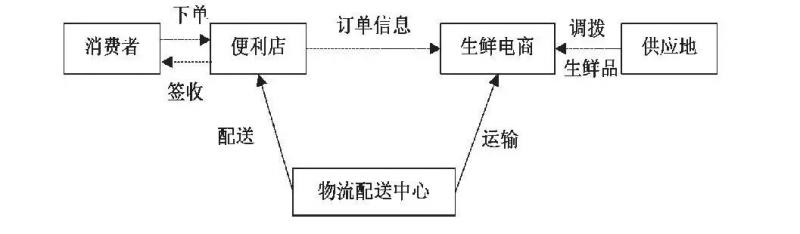 如圖5所示, O2O模式下的生鮮農產品電商運營過程首先由生鮮電商通過訂單信息從供應地調撥生鮮農產品, 電商再將產品運輸物流配送中心, 之后配送中心將產品配送到各大便利店, 消費者最后直接從便利店簽收。便利店會根據消費者的下單將訂單信息傳遞生鮮電商, 從而完成整個生鮮電商的運營。