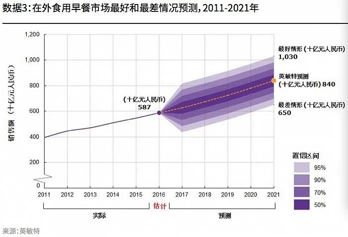 根據數據顯示,中國消費者早餐食品總消費從2015年的1.33萬億元將增至2021年的1.95萬億元,2016-2021年CAGR達到6.4%。而在外食用早餐市場銷售額預計到2021年將突破8400億元。