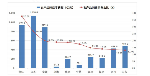 從數據來看,2020年全國縣域農產品網絡零售額為7520.5億元,占農產品銷售總額的13.8%,同比增長3.8%。在各個省份中,農產品網絡零售占比位居全國前三的分別是是浙江、江蘇、安徽的,占比為37.5%、26.6%和19.9%,而其農產品網絡零售額分別為940.6億元、1138.8億元、889.5億元。