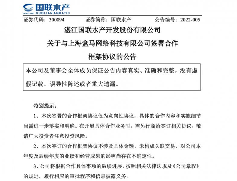 2022年1月11日,國聯(lián)水產(chǎn)與上海盒馬網(wǎng)絡(luò)科技有限公司(以下簡稱“盒馬”)簽訂了《合作框架協(xié)議》。