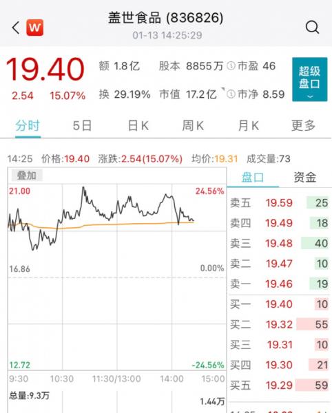 昨日,北交所股票蓋世食品(836826)以29.99%的漲幅強勢漲停,今日該股表現(xiàn)依然強勢,盤中一度漲至24.56%。