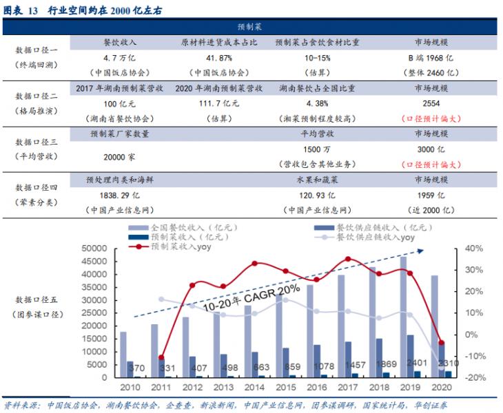 華創(chuàng)證券預計,從整體上看,當前我國預制菜市場規(guī)模約在2000億左右,其中B端1800億,C端400億,過去十年復合增長率保持在20%左右,其中2014-2019年復合增長率在30%左右。