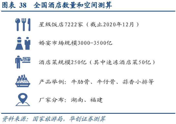 目前主要玩家有速凍酒店菜肴類企業(yè),如福建的綠進、亞明等,也有常溫/冷藏型酒店菜肴,如湖南的新湘廚、佳晏食品等,除此之外大型餐飲企業(yè)依托研發(fā)優(yōu)勢也紛紛進入。酒店菜多用于宴席市場等,假設(shè)滲透率在15-20%左右(略高于行業(yè)),預計酒店菜規(guī)模約有250億,其中速凍酒店菜肴規(guī)模約在50億以上。