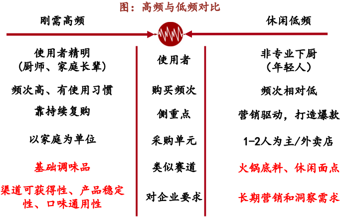 必選(高頻):比如生腌制品,屬于偏高頻的生意,使用者比較精明(廚師和中老年群體),復購較多,類似基礎調味品,消費頻次偏高頻,購買者有一定的使用習慣。但缺點是發展速度不會太快。這類生意看重渠道可獲得性、產品穩定性、口味通用性。