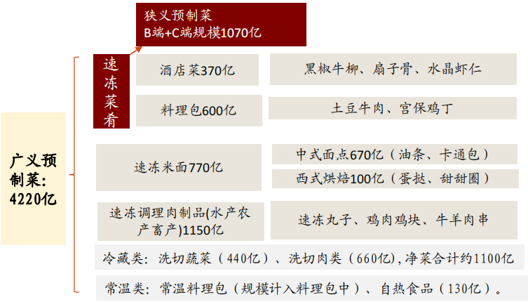 中國2020年廣義預制菜規模4220億左右(出廠口徑),其中,狹義預制菜1070億、速凍調理肉制品1200億、速凍米面750億、凈菜900億、自熱食品130億。