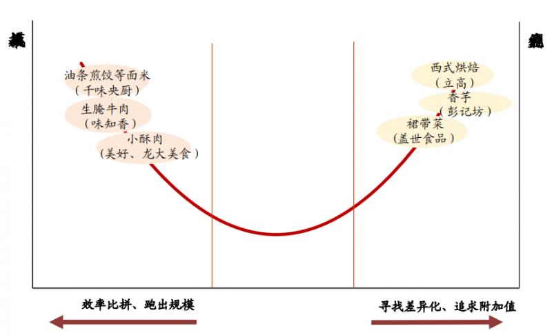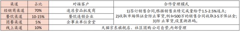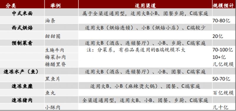 主線二:單品規模大,效率制勝——標準化程度。西餐>中餐;面點>菜肴——應用場景豐富度。? 一是適合渠道多樣性,產品需求差異度小,渠道覆蓋空間大,B端和C端渠道可以同時覆蓋。? 二是預制程度,加工深度決定菜品的應用場景。