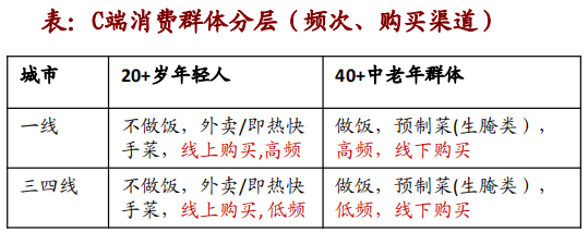 預制菜的風靡是否意味著C端已經爆發?? 個別品類爆發,如年夜飯半成品菜,消費者認知度已經很高,全品類爆發還需要時間。? 與生活節奏有很大關系,一線城市率先放量,三四線城市依然處于消費者培育階段。
