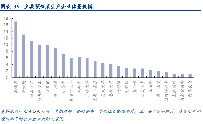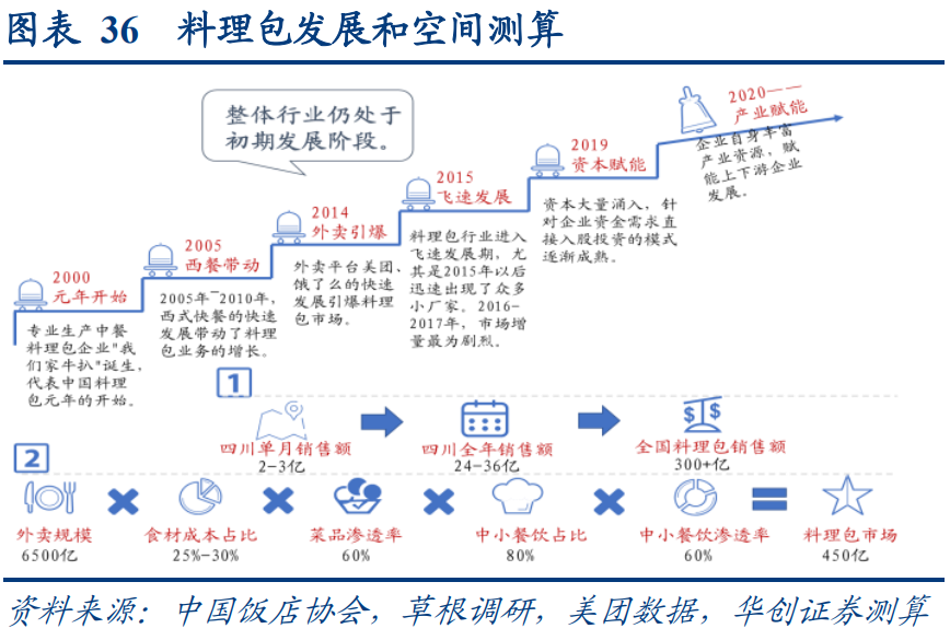 料理包下游主要對接小餐飲,不存在大型餐飲開發依托客戶關系、自建央廚反向替代等因素,整體競爭較為市場化,區域龍頭依托當地渠道網絡后可形成較強優勢。根據不同口徑,華創證券測算得全國規模約在500億級別左右。