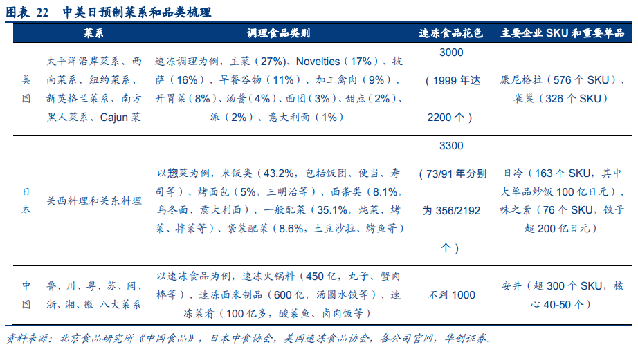 整體而言美日品類較為復雜,相較之下我國的菜品種類更多,而當下主要品類尚不及美日,考慮到我國擁有更大的市場規模,未來有更多挖掘空間。