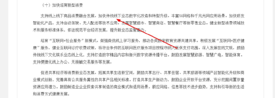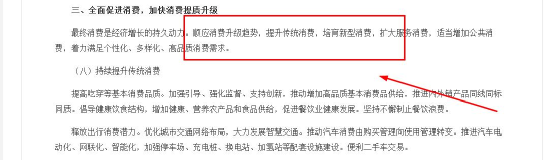 從汽車、旅游、醫療消費、教育消費到住房,到吃穿基礎消費,倡導健康飲食結構,增加健康、營養農產品和食品供給,促進餐飲業健康發展。