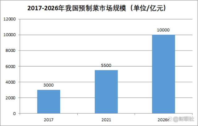 創業者扎堆入局、跨界玩家涌入、資本熱捧以及各項扶持政策的出臺,把預制菜推向了新的高度,讓預制菜迎來了黃金發展期,市場規模持續上漲。相關數據統計顯示,我國預制菜的市場規模從2017年的3000億元上漲到了2021年的5500億元,未來5年的復合增速有望達到13%,到2026年市場規模有望突破1萬億元。