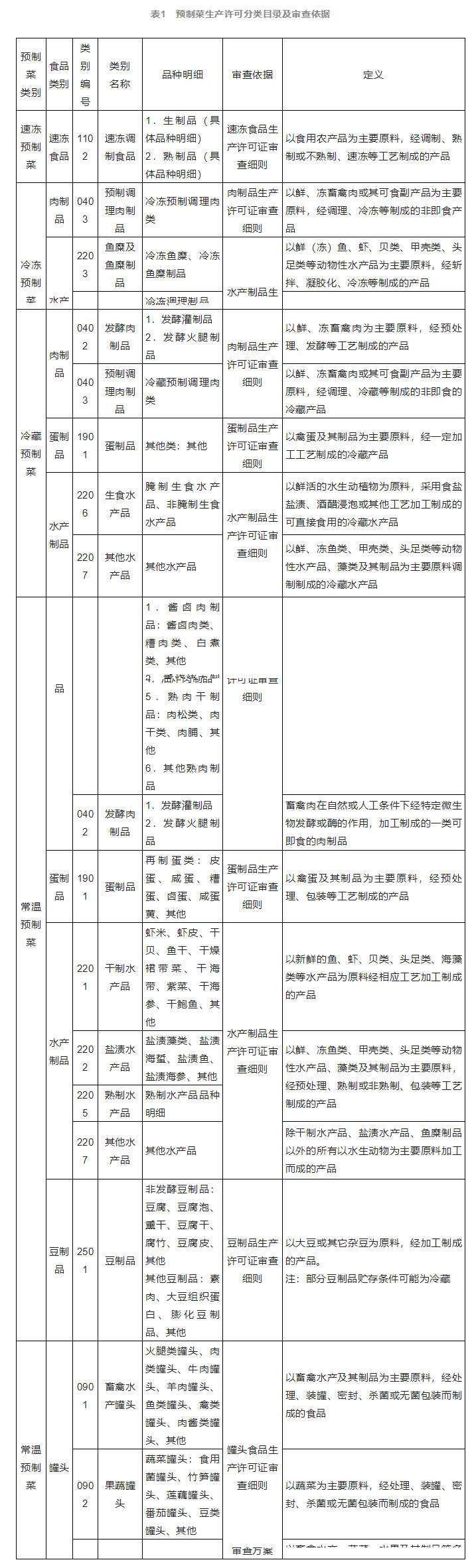 預(yù)制菜生產(chǎn)許可分類目錄及審查依據(jù)見表1。
