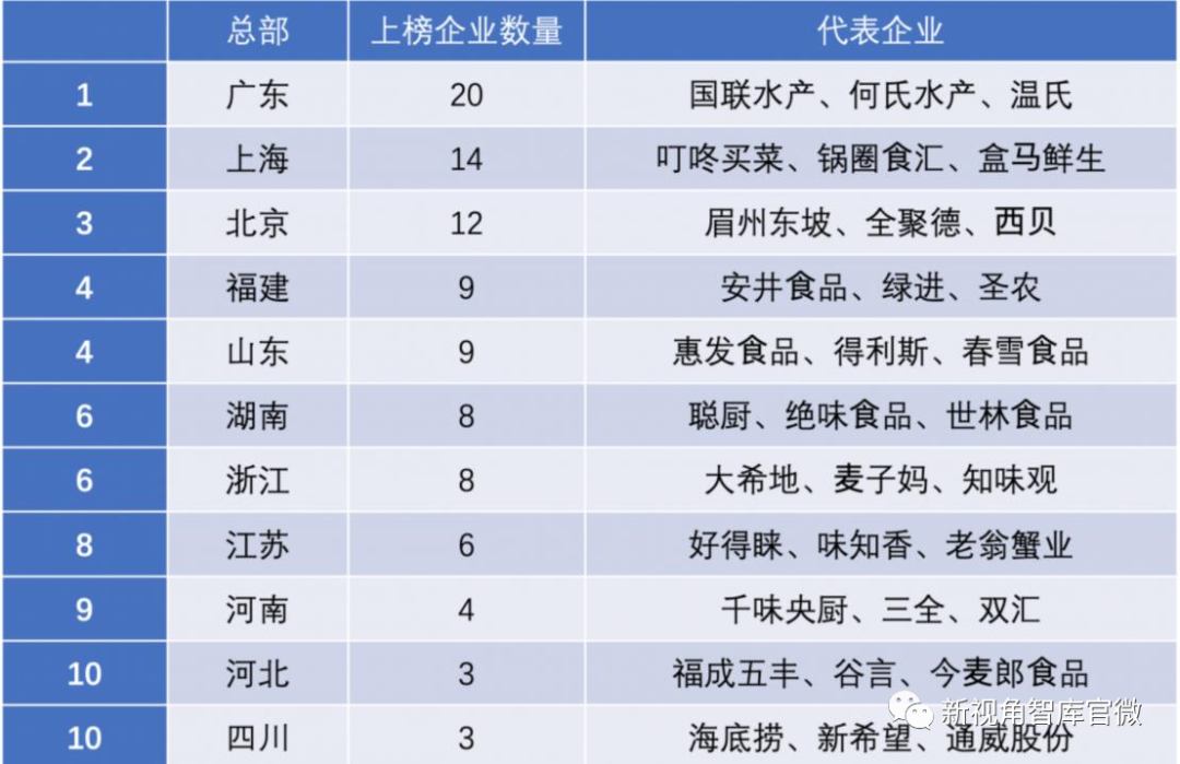 (6)餐飲供應鏈平臺:提供預制菜供應鏈服務,一般針對B端研發產品、生產加工以及采購運輸能力齊全,采用規模化采購,建立信息化配套體系。3月3日,胡潤研究院發布了《2023首屆中國國際(佛山) 預制菜產業大會·胡潤中國預制菜生產企業百強榜》,在榜單列出的100家中國預制菜百強企業中,總部位于廣東的企業最多,達到20家,上榜企業主要為國聯水產、溫氏、何氏水產等農林牧漁企業。此外,廣州、佛山兩城也各有6家預制菜企業上榜, 并列全國第三,僅次于上海和北京。胡潤中國預制菜生產企業百強榜單中,預制菜企業所產產品涉及即烹、即配、即食、即熱四大類;其中食品加工類企業上榜最多,占榜單一半以上,餐飲行業占比22%,農林牧漁行業占比18%。