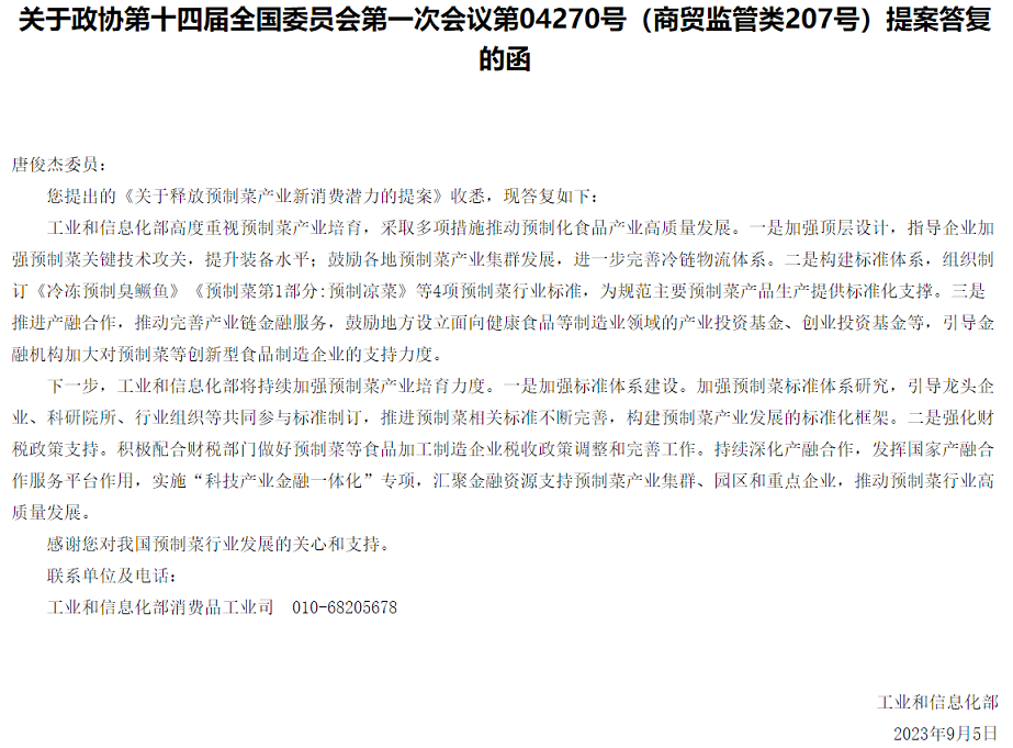 近日,工業和信息化部官網發布《關于政協第十四屆全國委員會第一次會議第04270號(商貿監管類207號)提案答復的函》,表示工業和信息化部高度重視預制菜產業培育,采取多項措施推動預制化食品產業高質量發展。