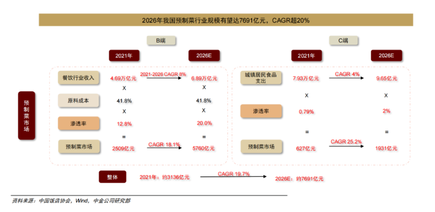 預(yù)制菜作為鄉(xiāng)村振興的重要產(chǎn)業(yè)和農(nóng)村一二三產(chǎn)業(yè)融合發(fā)展的新模式,近年受到各地政府高度關(guān)注,陸續(xù)出臺行業(yè)利好政策。2026年中國預(yù)制菜行業(yè)規(guī)模有望達(dá)7691億元,CAGR超20%。