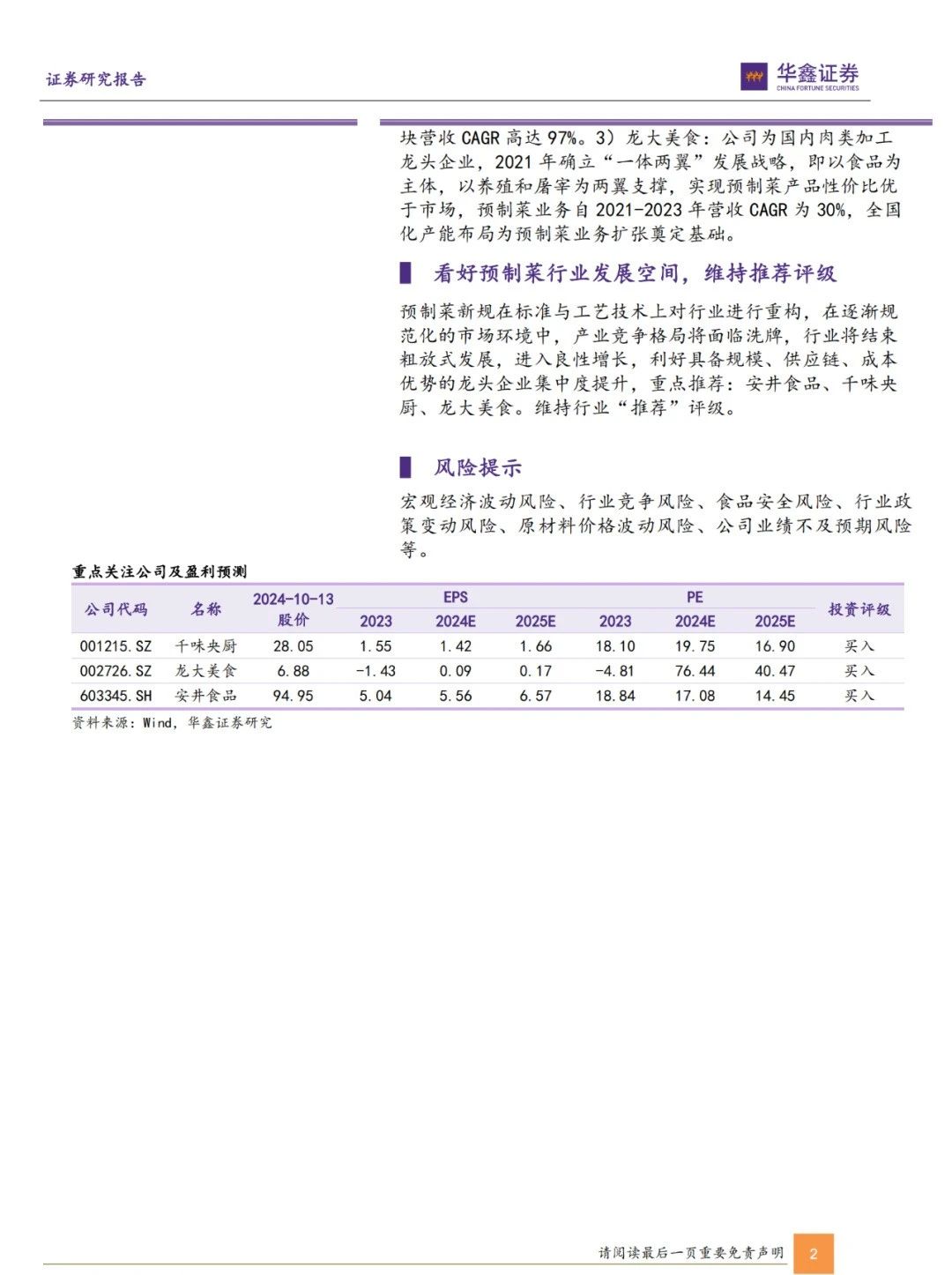考慮規模、渠道、供應鏈三個維度,我們選取安井食品、千味央廚、龍大美食作為重點企業分析。1)安井食品:作為國內速凍龍頭,公司 2021 年提出“三路并進”戰略,通過自產(安井小廚)+貼牌(凍品先生)+外延并購(新宏業+新柳伍)布局預制菜業務,公司渠道推力強,預制菜板塊 2018-2023 年營收 CAGR 為 58%,隨著產能自供率提升,盈利空間持續打開。2)千味央廚:公司為 B 端提供速凍品解決方案起家,客戶資源與研發優勢明顯,由于綁定百勝、海底撈等核心大客戶,疊加大單品蒸煎餃放量,2018-2023 年預制菜板塊營收 CAGR 高達 97%。3)龍大美食:公司為國內肉類加工龍頭企業,2021 年確立“一體兩翼”發展戰略,即以食品為主體,以養殖和屠宰為兩翼支撐,實現預制菜產品性價比優于市場,預制菜業務自 2021-2023 年營收 CAGR 為 30%,全國化產能布局為預制菜業務擴張奠定基礎。