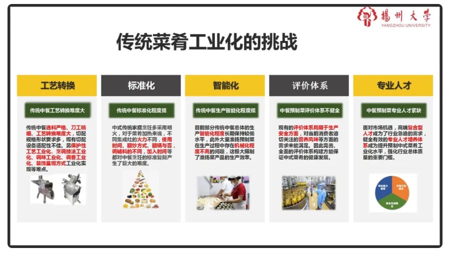 傳統菜肴工業化面臨五個方面的挑戰:1.工藝轉換難度大;2.標準化程度低;3.智能化程度低;4.評價體系不健全;5.專業人才緊缺。