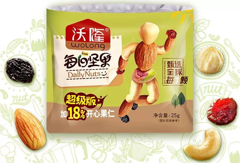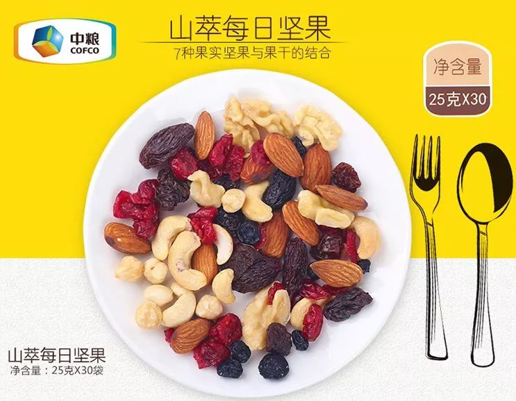 從功能上來說,中國營養學會建議一般人群每天食用堅果的量為 10 克左右的標準。目前從市面上來看,是百草味、洽洽、三只松鼠、沃隆等眾多企業的“混合堅果”,每一袋的重量幾乎都為 25 克左右,里面一般有 5~6 種堅果,比如核桃仁、腰果仁、榛子仁、夏威夷果仁、扁桃仁、南瓜子等,還有 2~3 種水果干,比如蔓越莓干、藍莓干、葡萄干、紅棗干等等,堅果和果干比例基本上以 1:1 配比,滿足了中國營養學會的推薦攝入量每天 10 克左右。