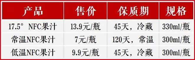 據悉,新品此次推出了蘋果汁、橙汁和芒果混合汁三種口味,規格為300ml/瓶,零售價為9.9元。產品同農夫山泉17.5°果汁一樣采用低溫冷鏈運輸,保質期同為45天。