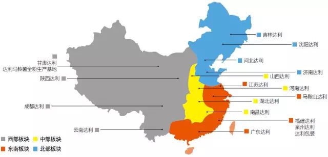 目前,達利有六大類產品,涵蓋糕點、薯類膨化食品、餅干、涼茶、復合蛋白飲料及功能飲料,超過720個單品以及107個飲料單品,產品鏈條廣而深。與之匹配的是18家子公司、30個食品飲料生產基地和3847家經銷商。它們以福建為中心,逐漸輻射全國,就像一張大網,覆蓋國內一至三線城市。