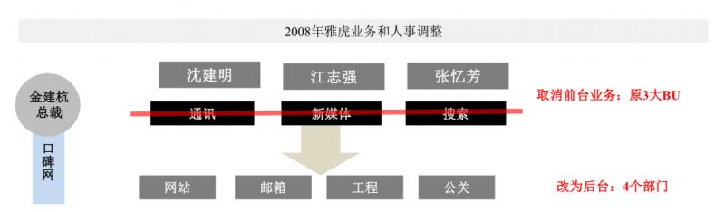 2008年1月,雅虎從事業部制轉變為后臺部門,除了保留口碑業務外,其他業務均被取消或邊緣化,裁員高達400余人。在此前,雅虎中國原CEO謝文于2006年11月離職,曾鳴出任CEO,2008年1月調回總部,金建杭出任CEO。同年,7月26日,馬云在內部信中號召全體員工準備過冬,明確了集團未來10年要聚焦零售。