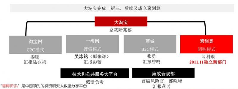 2010年-2011年,大淘寶“一拆三”,C2C淘寶網+ B2C淘寶商城 + 搜索一淘網。共享技術平臺,由戴珊負責。支付寶換帥,彭蕾出任支付寶總裁,同時繼續兼任集團人力總監,優化產品和客戶體驗,原支付寶CEO邵曉峰2010.3調回集團總部。2011年,10 月18 日,聚劃算獨立,2012年聚劃算GMV達到208億元。