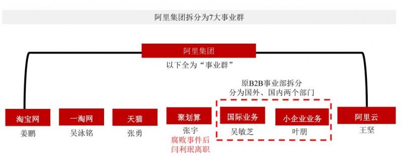 具有重要的戰略意義,首先是組織自我變革,以此應對劇烈的外界競爭(京東、唯品會等對手崛起)和移動端流量的崛起;其次是重新配置資源,化解內部矛盾,給年輕人晉升的空間;最后,提拔接班人,5月馬云卸任CEO,陸兆禧接任,9月張勇被任命為集團COO執行移動。