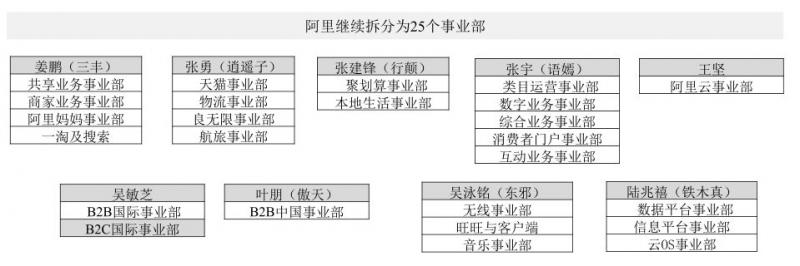 2013年1 月10 日,從7 大事業群繼續拆分為25 個事業部。采取總裁負責制,內部賽馬,馬云評價為:“阿里13年來最艱難的一次組織、文化變革”。