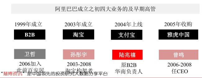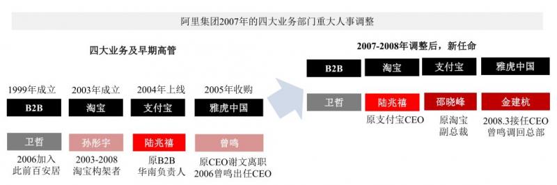 2007年-2009年,阿里巴巴四大業務板塊進行了重大人事調整。淘寶原CEO孫彤宇(淘寶教父)離職,陸兆禧接任淘寶CEO;陸兆禧調離支付寶后,原淘寶副總裁邵曉峰接任支付寶CEO;雅虎中國原CEO曾鳴調回總部,金建杭接任雅虎中國CEO。