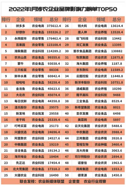 近日,農(nóng)業(yè)新媒體聯(lián)盟、企查查、農(nóng)業(yè)行業(yè)觀察聯(lián)合發(fā)布了《共譜鄉(xiāng)村振興·中國(guó)涉農(nóng)企業(yè)品牌影響力1月榜單TOP50》,在50多家涉農(nóng)企業(yè)的品牌輿情監(jiān)測(cè)、自媒體運(yùn)營(yíng)、搜索引擎數(shù)據(jù)及口碑影響力排名結(jié)果中,拼多多、好想你、永輝超市再次獲得榜單前三名,另外前10名中農(nóng)業(yè)食品企業(yè)占了4例,農(nóng)業(yè)零售也占了4例,農(nóng)業(yè)電商和農(nóng)業(yè)科技企業(yè)也各有1例。