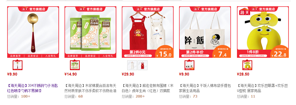 與此同時,海天味業還布局了勺子、百潔布、圍裙、棉布袋、U型枕等廚房用周邊產品,為品牌樹立更加年輕潮流的品牌符號。