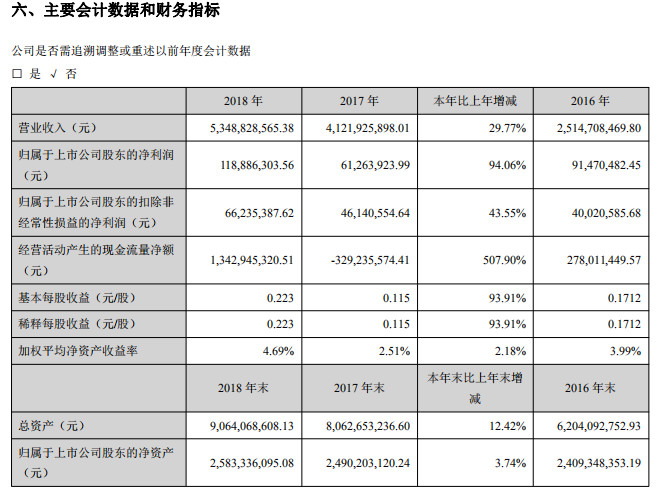 河南華英農業發展股份有限公司 2018 年實現營業總收入 53.49 億元,同比上升 29.77%;實現歸屬于上市公司股東的凈利潤 1.19 億元,同比上升 94.06% 。其中,凍鴨產品營業收入 14.56 億元,同比增長 22.14%,鴨苗營業收入 4.57 億元,同比增長 79.23%,熟食營業收入 3.26 億元,同比增長 19.66% 。