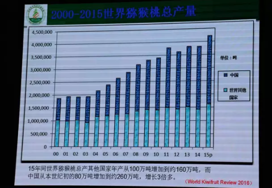 價格上國產獼猴桃絲毫沒有優勢,那在出口上又是什么情況呢?在說這個問題之前,先看看國產獼猴桃的種植規模和產量,筆者曾在眉縣參加第五屆獼猴桃產業大會,來自中國科學院武漢植物園的姜正旺老師曾在大會上公布過一組數據:2015年中國獼猴桃的栽種面積約15萬公頃(約225萬畝),產量約260萬噸。在世界獼猴桃產業中,無論是種植規模還是產量,中國當之無愧的第一名。但這個第一名好像并沒有帶來什么耀眼的光芒。