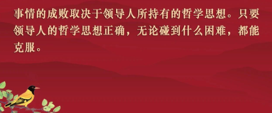 事情的成敗取決于領導人所持有的哲學思想。只要領導人的哲學思想正確,無論碰到什么困難,都能克服。