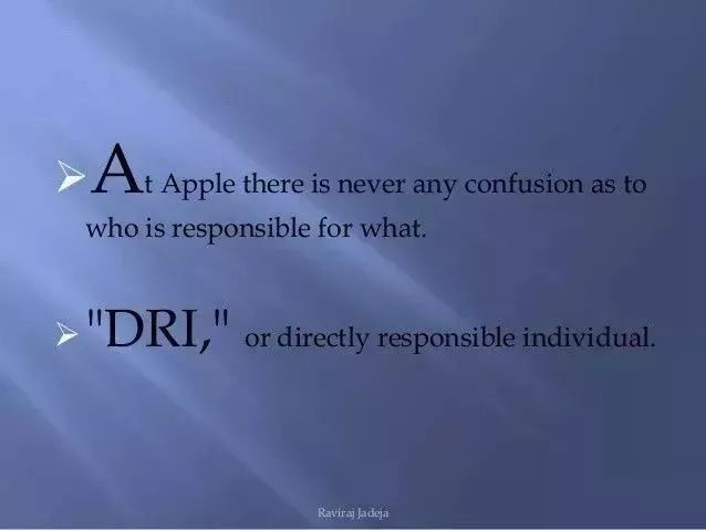 在蘋(píng)果,誰(shuí)負(fù)責(zé)什么,永遠(yuǎn)不會(huì)搞混。DRI的名字經(jīng)常出現(xiàn)在會(huì)議進(jìn)程表上,每個(gè)人都知道誰(shuí)是直接負(fù)責(zé)人。